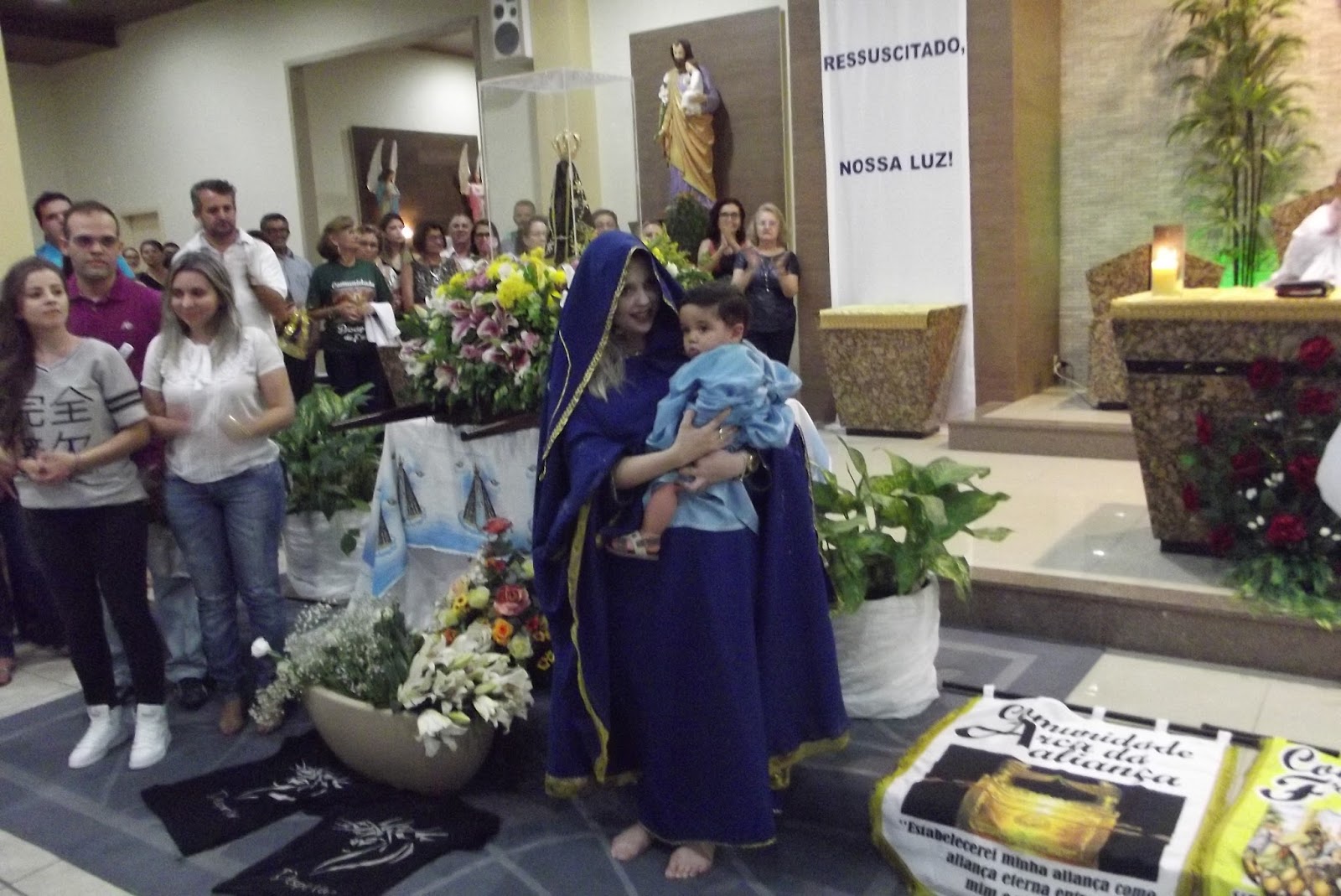Na procissão de entrada uma mãe de cada comunidade homenageou Nossa Senhora ofertando um buquê de flores, oferecido com todo amor e carinho. As comunidades estavam representadas com suas camisas, estandartes e bandeiras, vivenciando esse momento festivo.